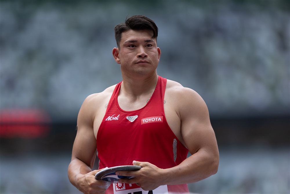 ニシ・スポーツが、円盤だけでなく機能性ウエア「HIGH TECH LINE」や共同開発の円盤投練習専用ギア「ディスカストレーナー円心」でサポートする湯上選手。